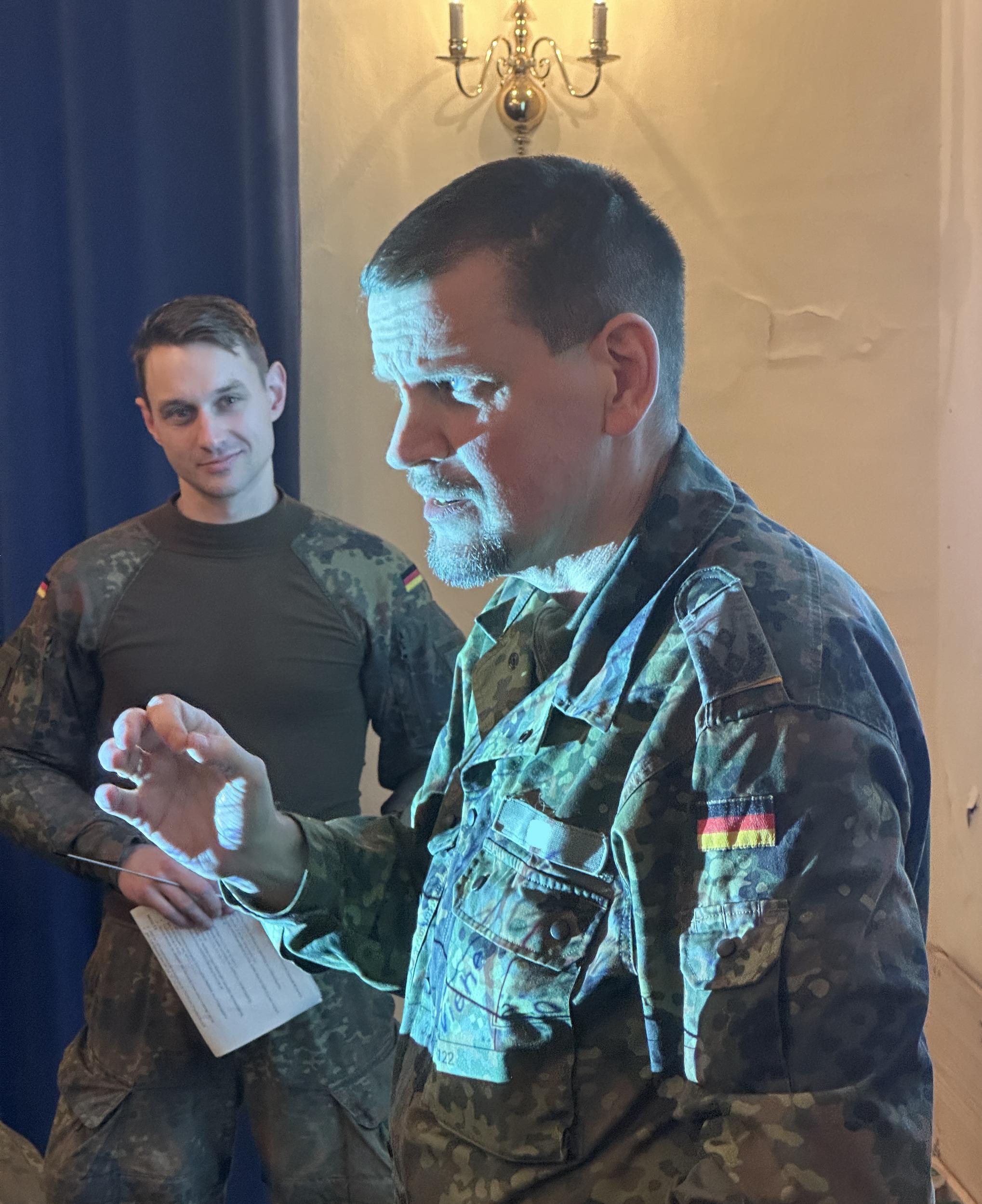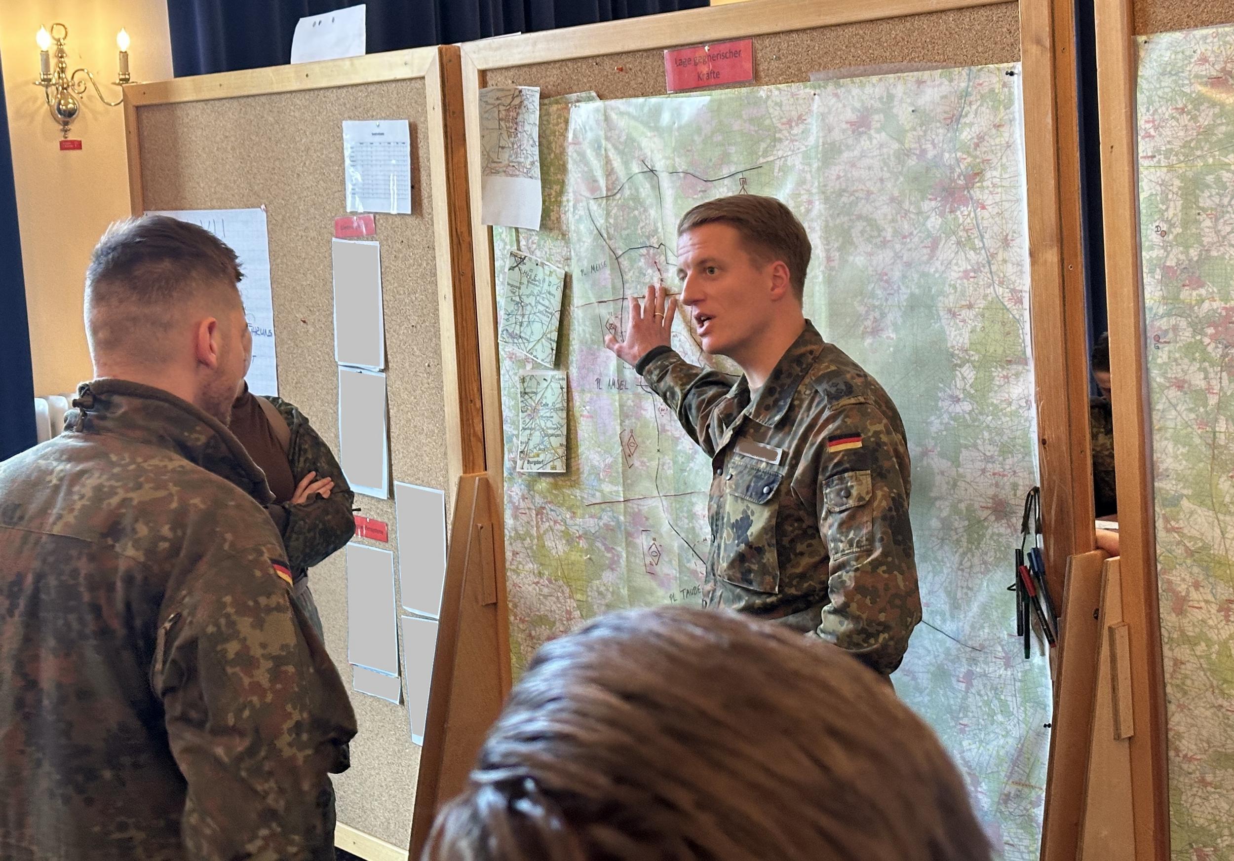 Herausforderungen aktueller Kriegsszenarien setzte der anlegende Hörsaalleiter, Oberstleutnant Hilgendorf, konsequent um; gegnerische Flugabwehr, Kräfte des elektronischen Kampfes, Kleinstdrohnen und Flüchtlingsbewegungen forderten den Offizieren alles ab!
